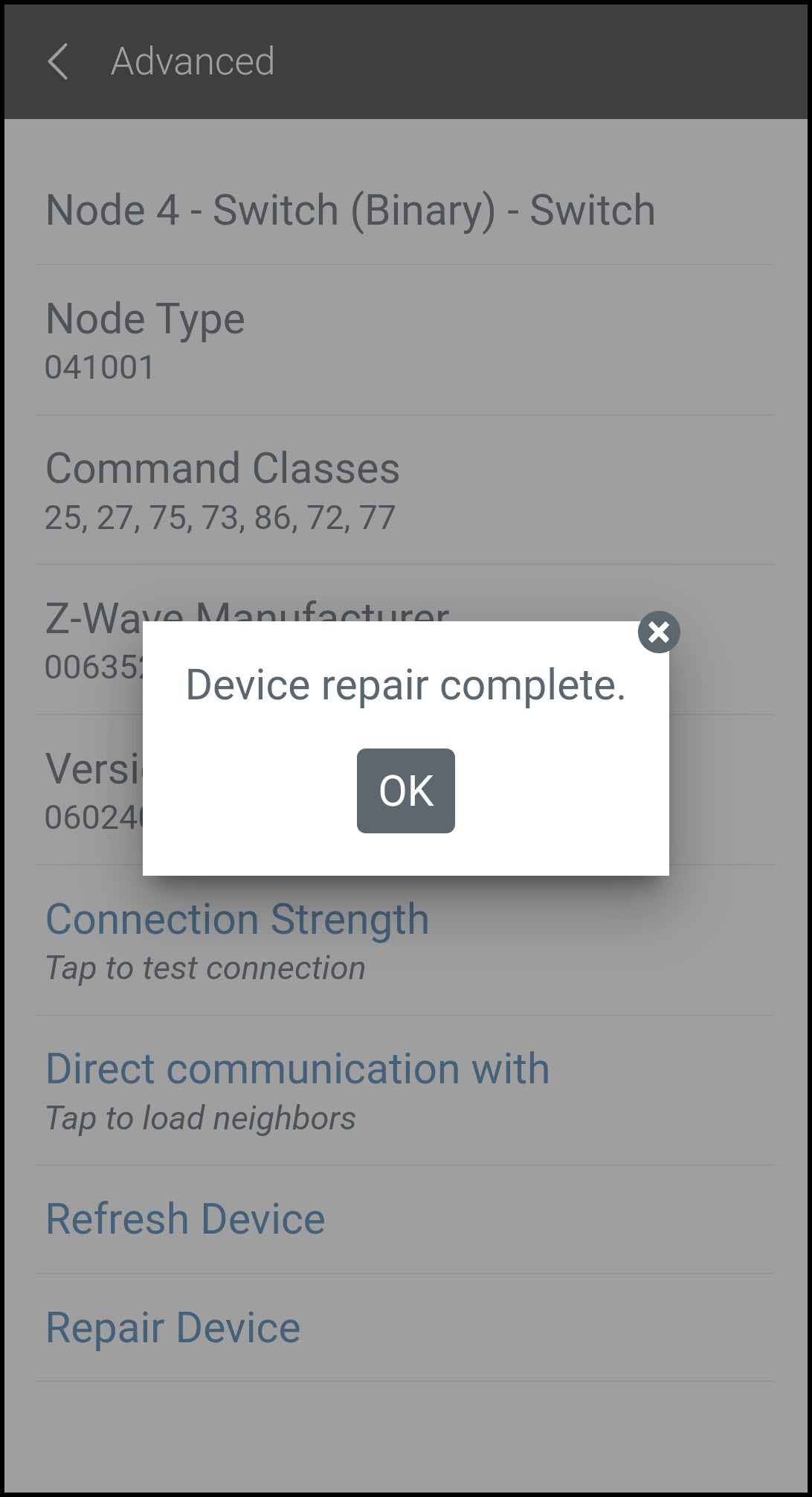 Repairing a Z-Wave device will test to see if the device is still communicating in both directions. Because sensors only communicate in one direction, sensors cannot be repaired.