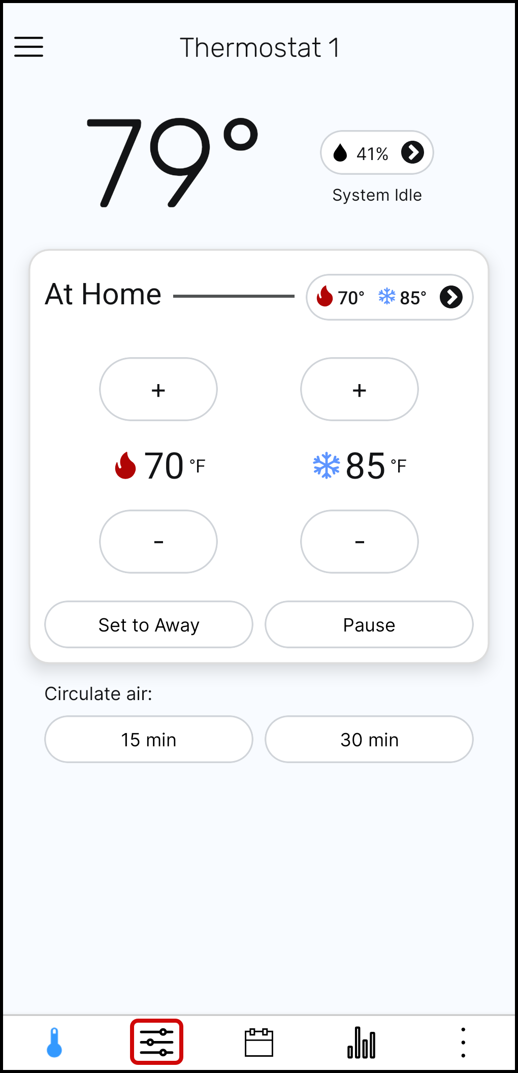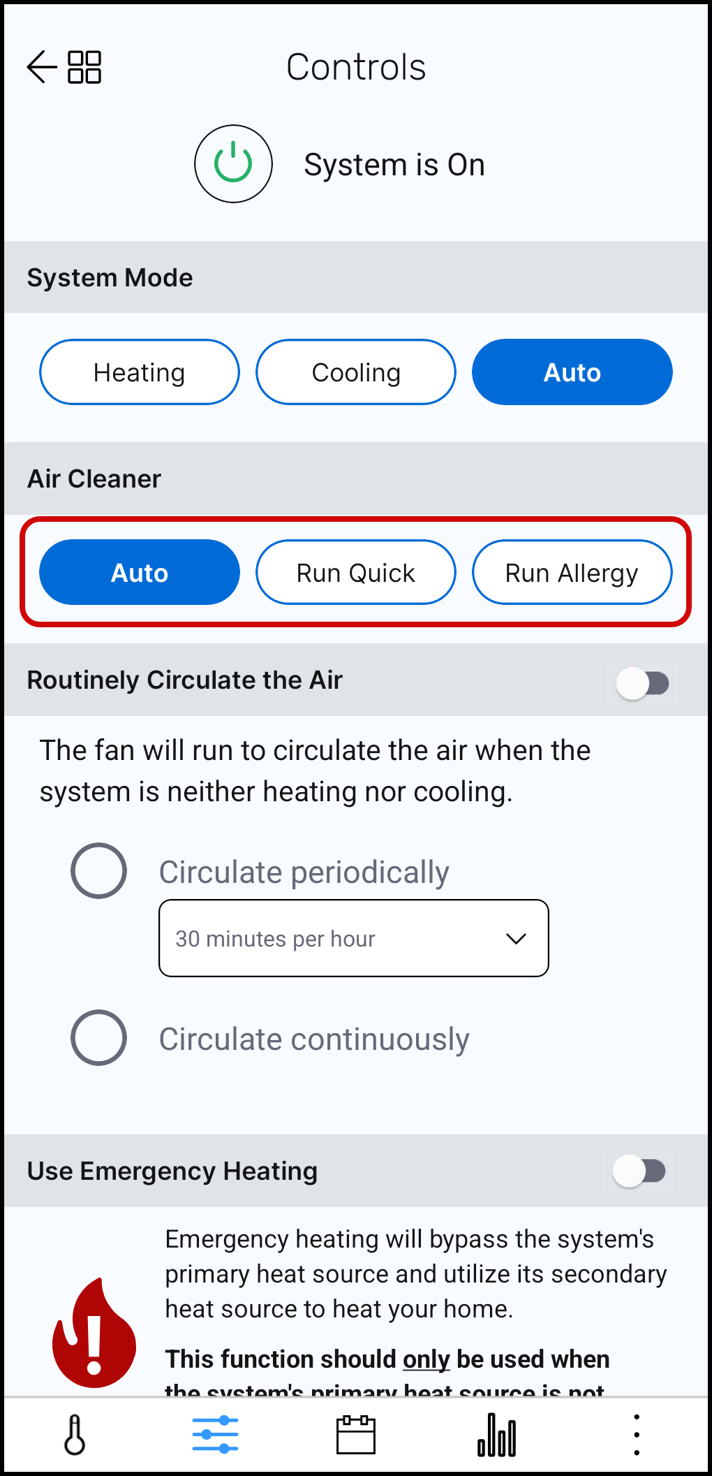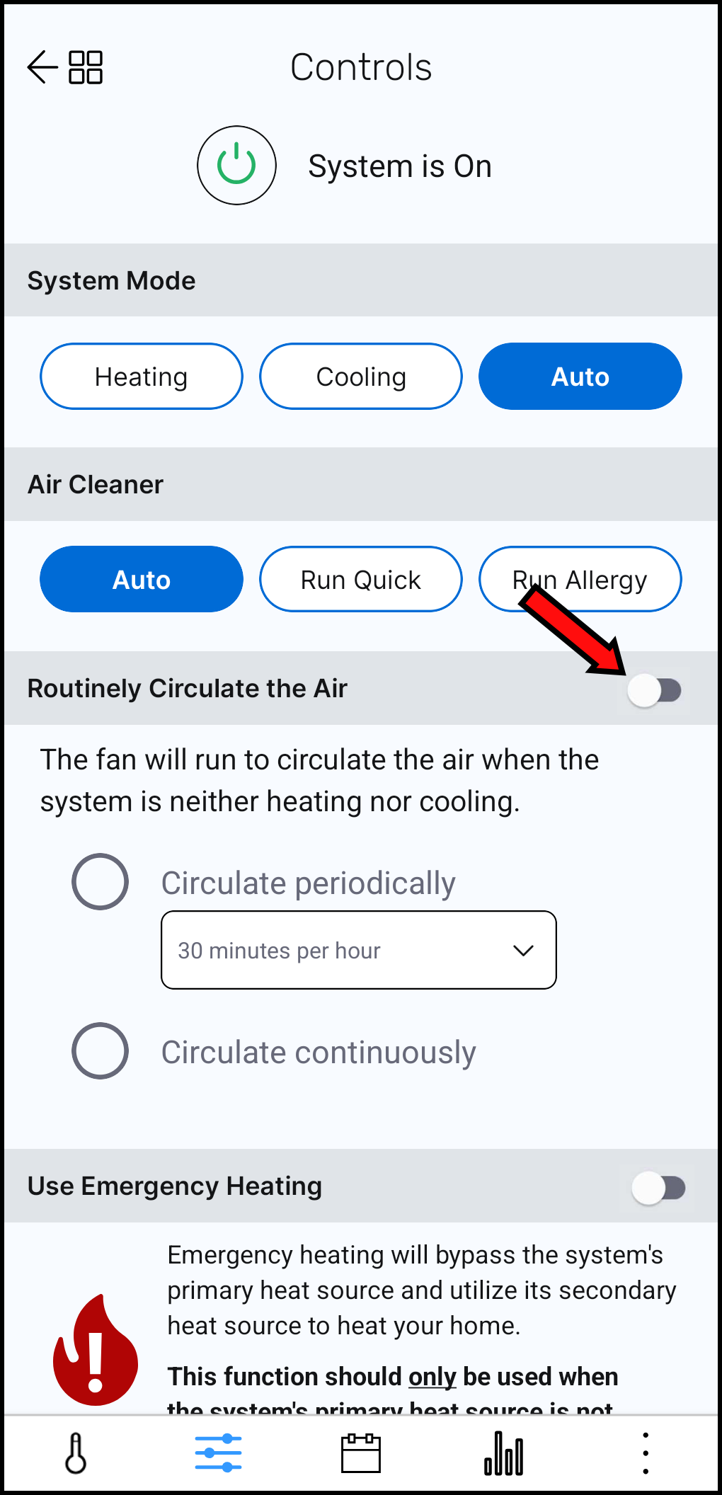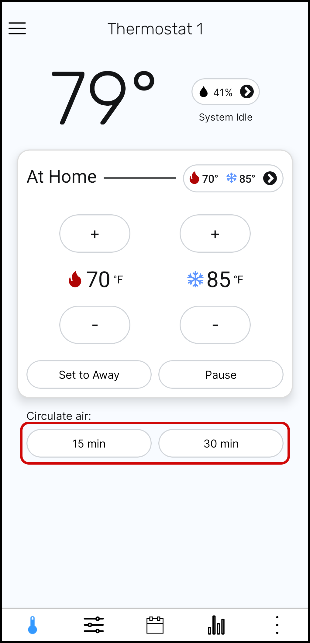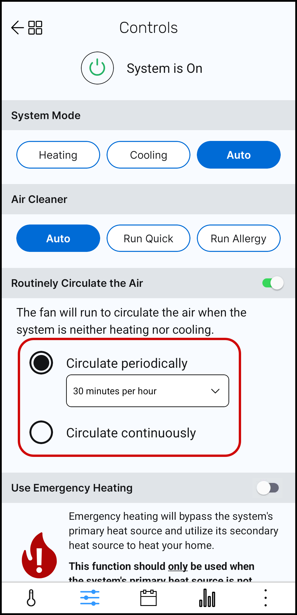 All routines include the Circulate Air feature, allowing you to run the fan on demand for 15 or 30 minutes unless the fan has been set to run regularly or continuously. If the fan is set to run regularly or continuously, the Circulate Air option will not be present.