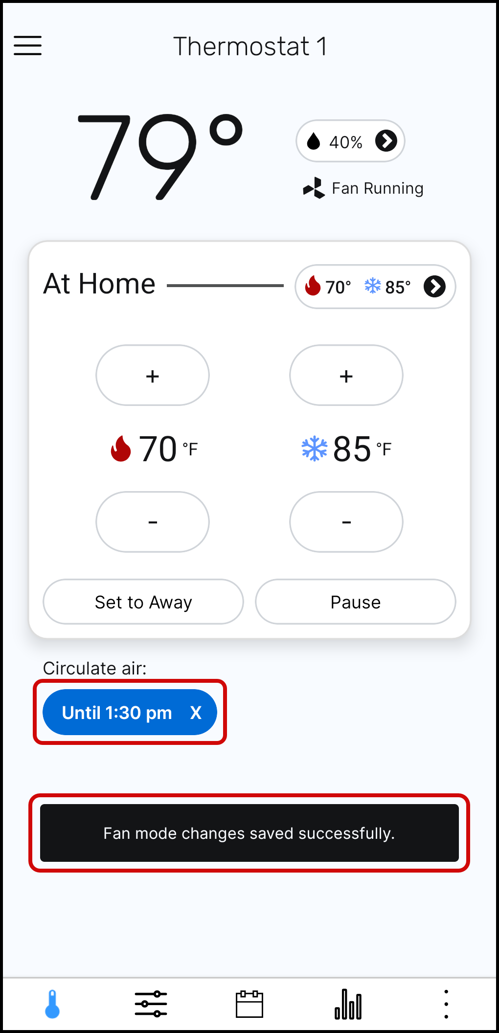 A message will appear confirming the fan mode changes were made, and a blue bubble will appear under Circulate Air to indicate when the fan will automatically stop. If you want to stop the fan cycle early, tap the X in the far right of that bubble.