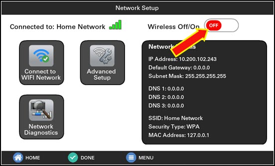 - Press Wireless ON/OFF to turn the wireless network back on. It may take up to 30 seconds for WiFi to be restored and the thermostat to reconnect.
