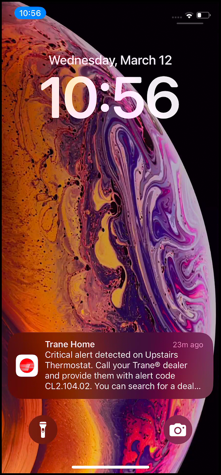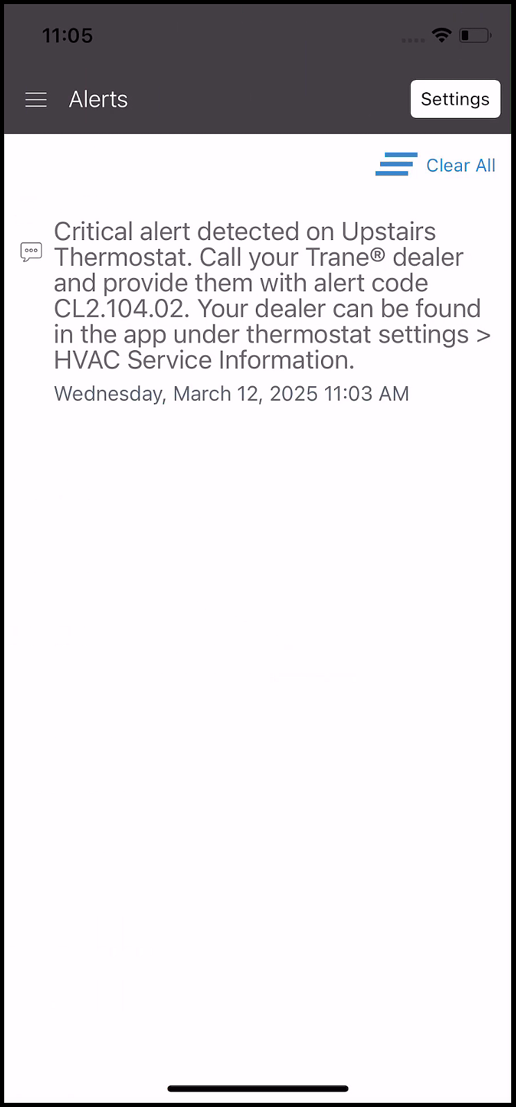 [Home name]: Critical alert detected on [thermostat name]. Call your Trane® dealer and provide them with alert code [error ID]. Your dealer can be found in the app under thermostat settings > HVAC Service Information. Push Notification Alert in Trane Home App