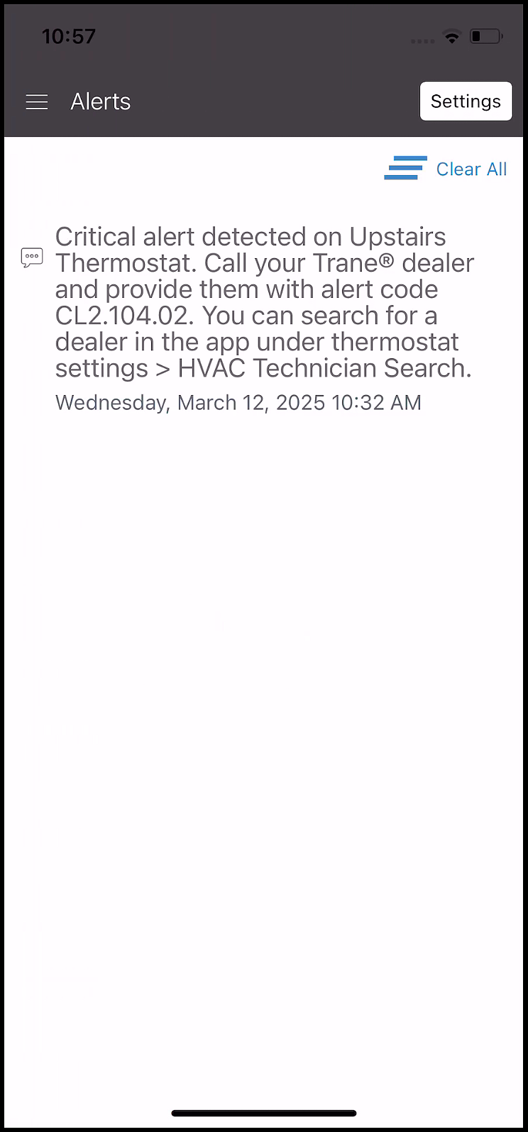 [Home name]: Critical alert detected on [thermostat name]. Call your Trane® dealer and provide them with alert code [error ID]. You can search for a dealer in the app under thermostat settings > HVAC Technician Search. Push Notification Alert in Trane Home App