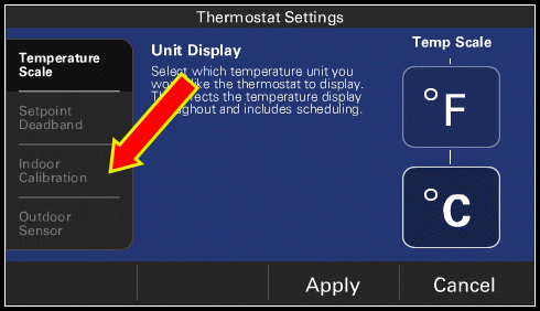 On the thermostat main screen, go to Menu→Settings→Thermostat→Indoor Calibrations.