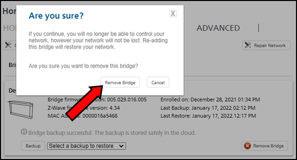 NOTE: You can only restore your existing configurations to the new bridge if your backup is successful. If the backup is successful, you will see a message confirming its success. If you see any other message, your backup did not work and you will need to try again.