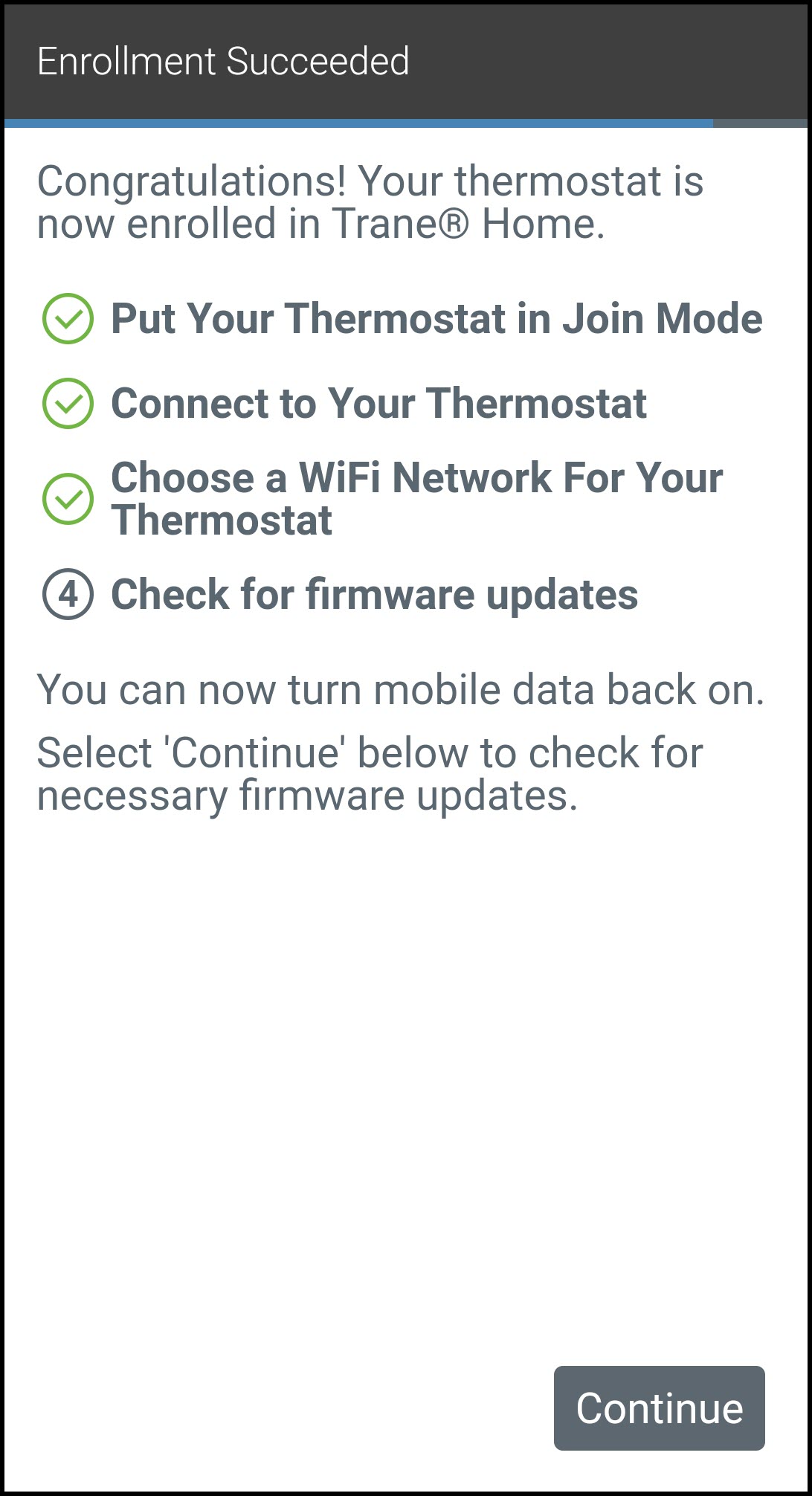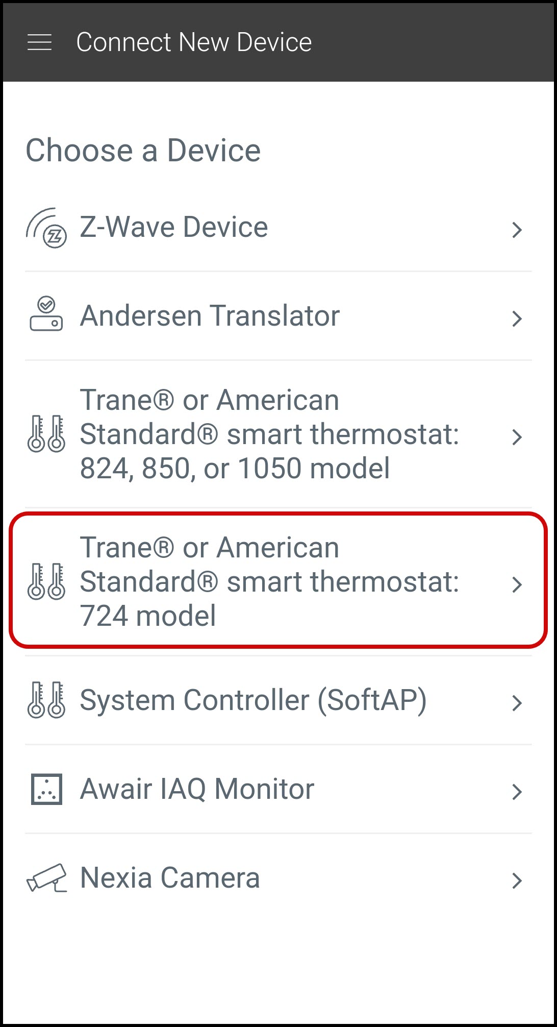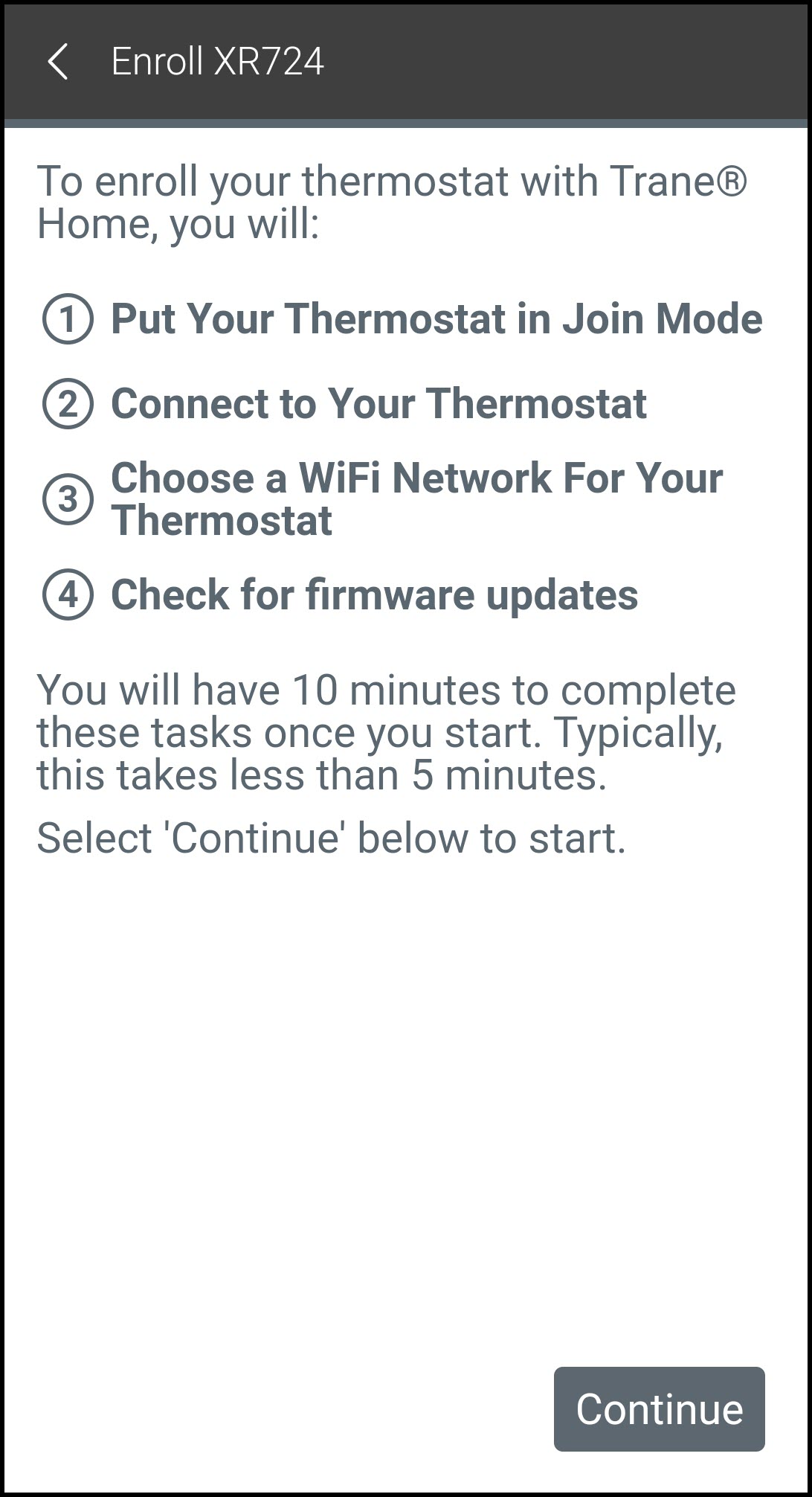 A Trane XR724 WiFi thermostat can only be enrolled using the Trane Home mobile application. If you have not already done so, please download the Trane Home app from the Apple App Store® or Google Play™ store at this time.