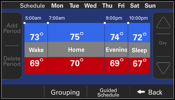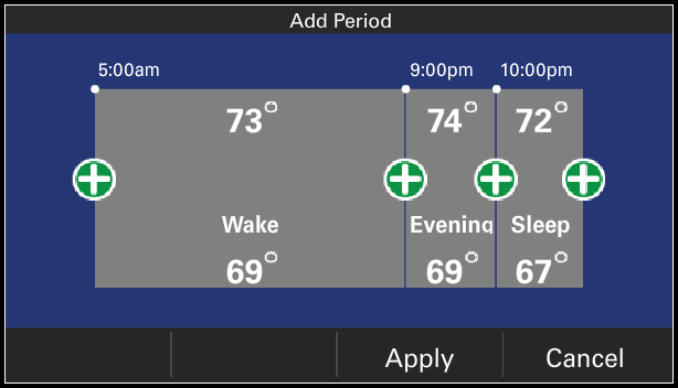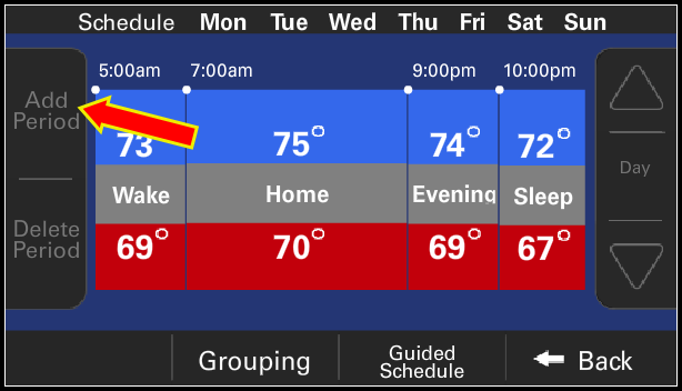 Select Add Period to set a daypart. You can have up to four periods defined, and the thermostat will display a message to this effect if you already have four periods.
