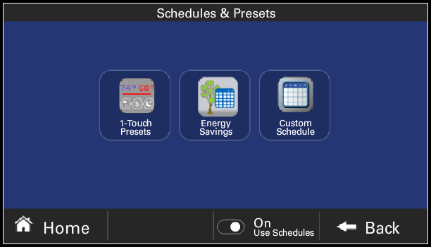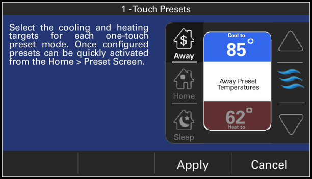 - 1-Touch Presets - Easily set any one of the three most common schedules: Away, Home, and Sleep
