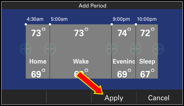 Follow all of the prompts and press Apply when it appears on the screen. The thermostat will apply the changes and return to the Custom Schedules screen after a few moments.