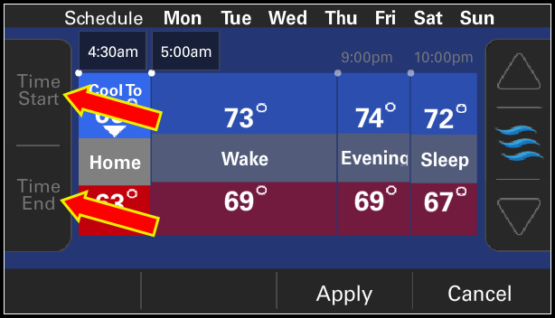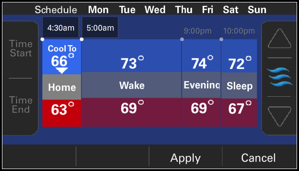 - The arrows on the right side of the screen will display three waves. If Cool To is selected, the waves will be blue and if Heat To is selected, the waves will be red. Use the up and down arrows to change the temperature and select Apply. It may take a few moments for the thermostat to apply the updates.