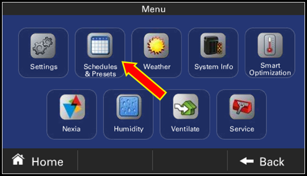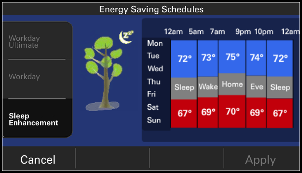 - Energy Savings - This allows you to select a specific Energy Saving schedule that cannot be modified. There are three options: Workday, where heating and cooling are set for energy savings during the workday; Workday Ultimate, where heating and cooling are set for higher energy savings during the workday; and Sleep Enhancement where heating and cooling are set for energy savings on a schedule that is identical for all days to enhance your sleep.