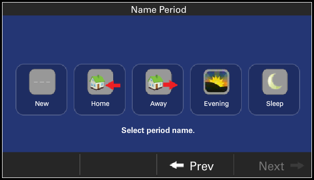 Choose Home, Away, Evening, or Sleep to use a pre-defined period name or choose New to define your own period name. Press Next to proceed.