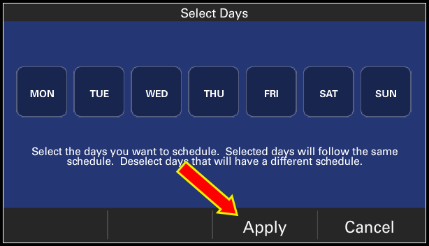 Select the days of the week that will follow the same schedule. If individual days will follow their own schedules, select only that day of the week. Press Apply when done.