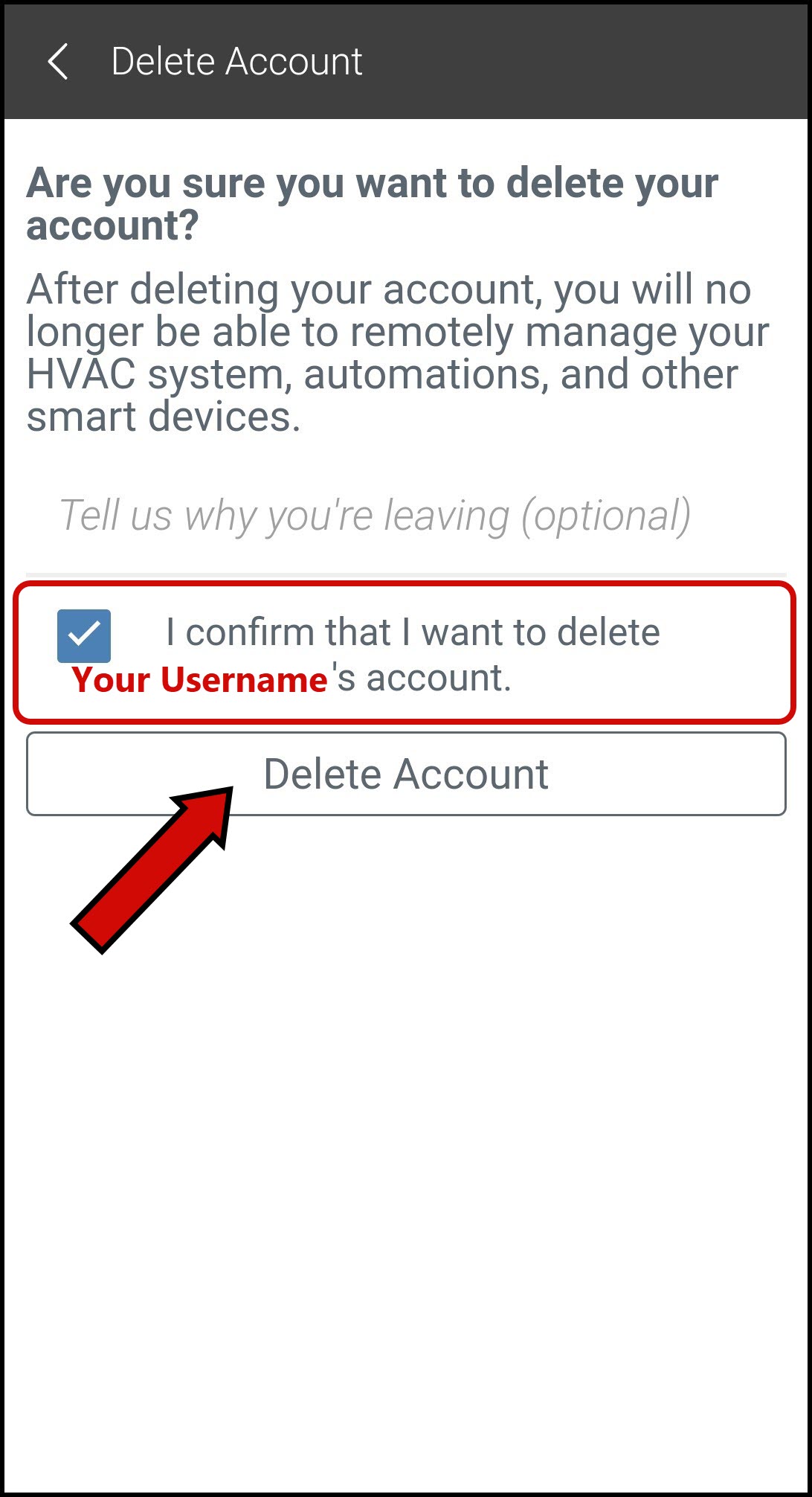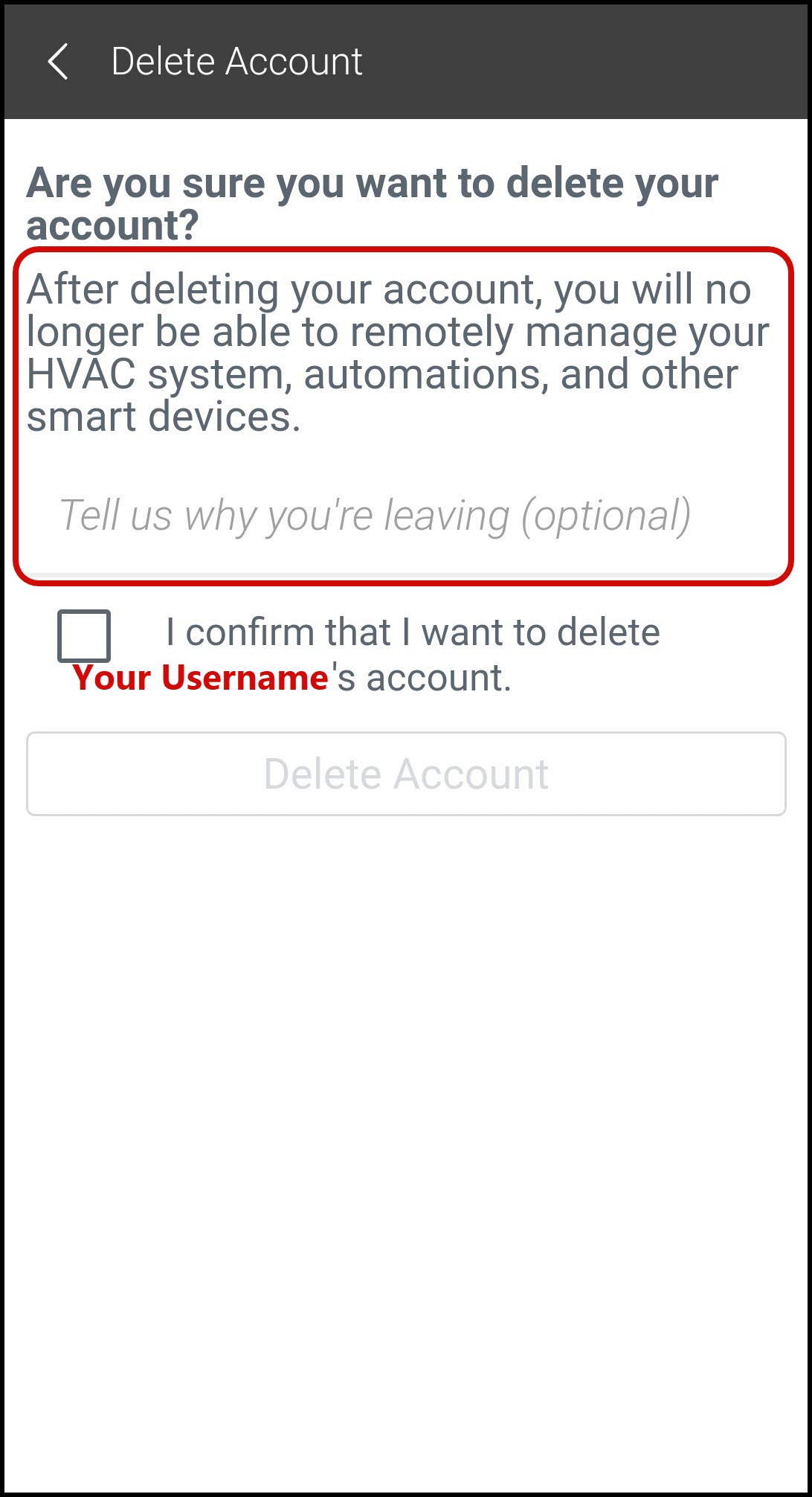 Please read the message at the top of the Delete Account screen. If you choose to proceed, please let us know why you are canceling.