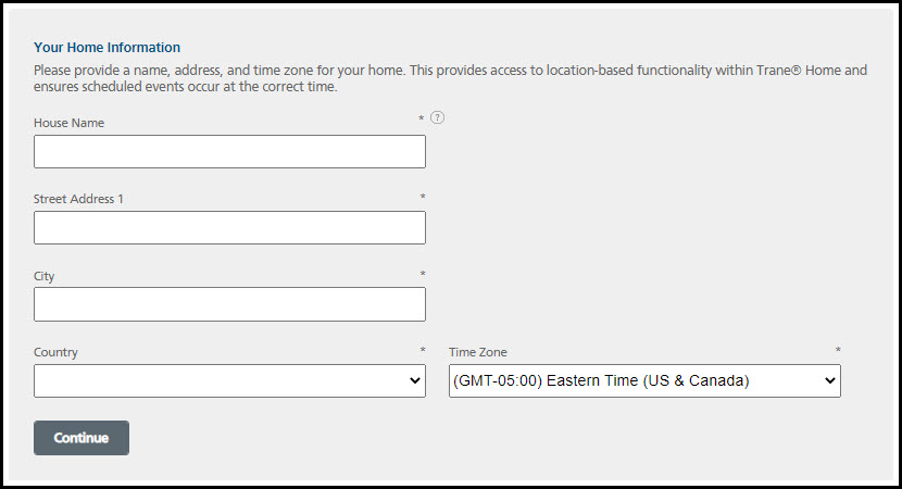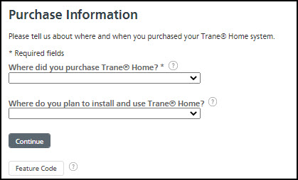 You will be prompted to answer a few questions about your Trane Home purchase. Answer the questions using the drop-down boxes and click Continue.