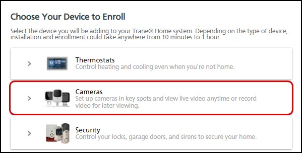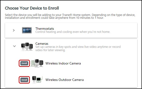 You can enroll your camera either through the Trane Home web portal or the mobile app. However, it is recommended that you enroll using the web portal to be able to set up your camera's wireless connection.