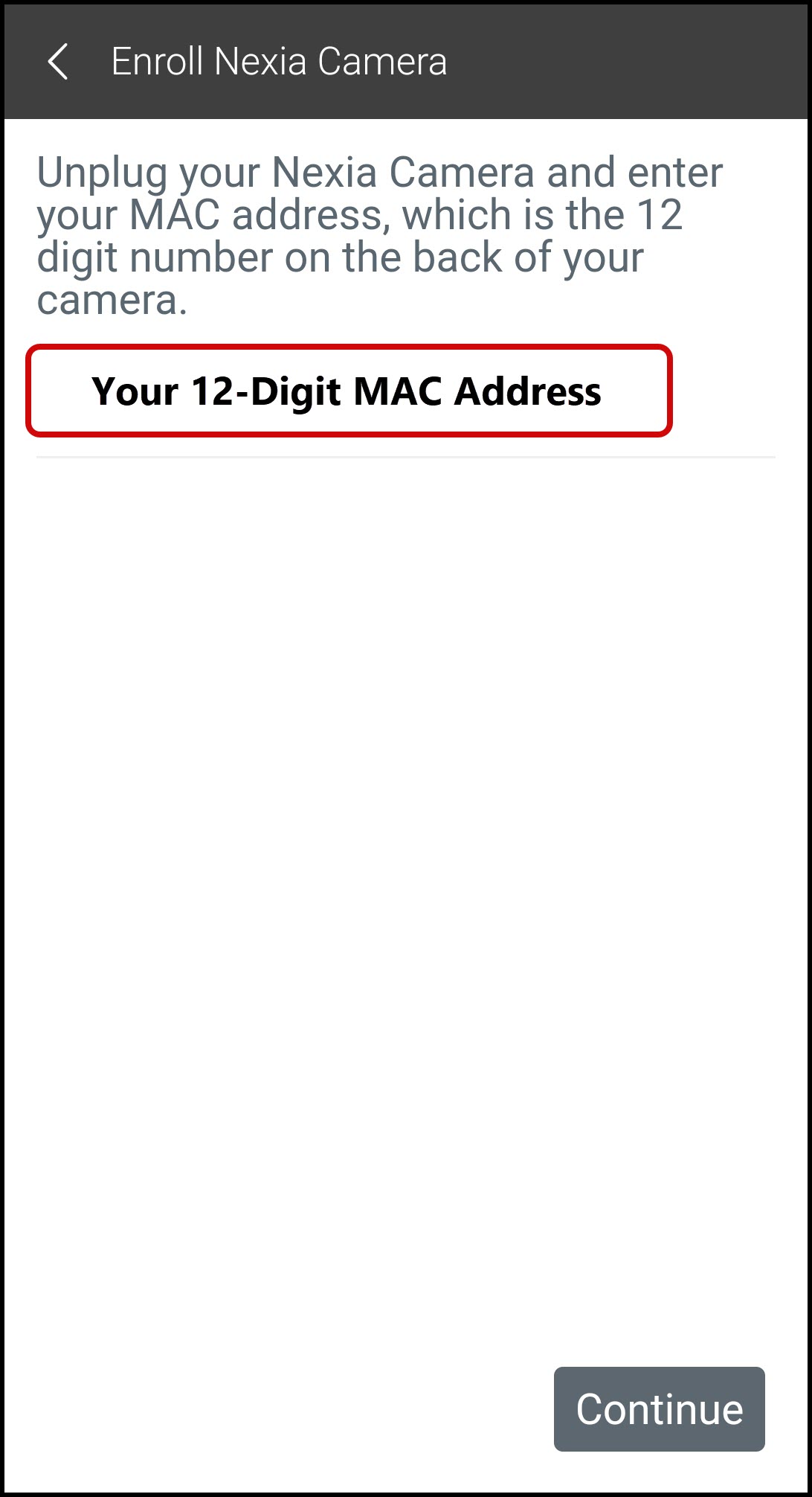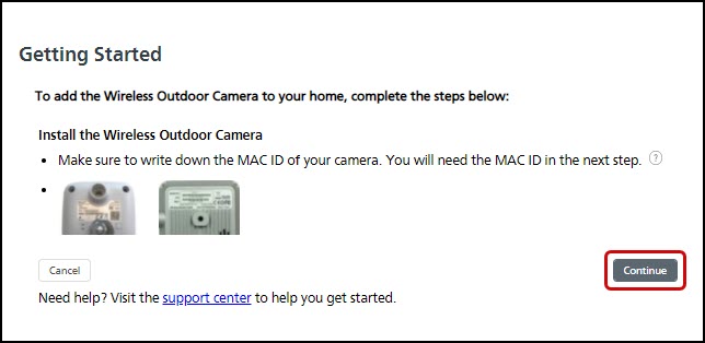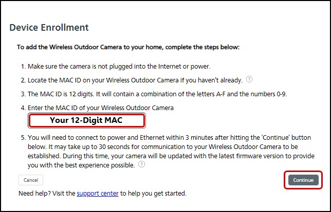 Enter the MAC address of your camera and press Continue.