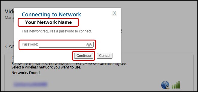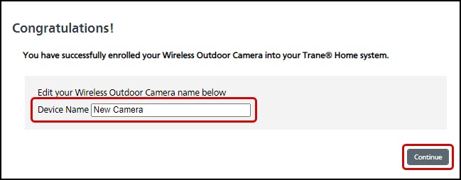 - Once the camera connects (generally after 2-3 minutes), you should be prompted to enter a new name for your camera. Enter the new name and press Continue.