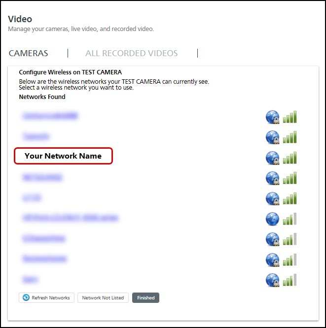 The camera will begin searching for wireless networks. Select your network when it has been found.