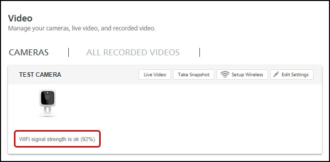 - The camera will report its wireless signal strength under the image of the camera in the portal. Once the camera has successfully connected, you can install it in its intended location.