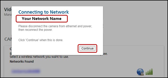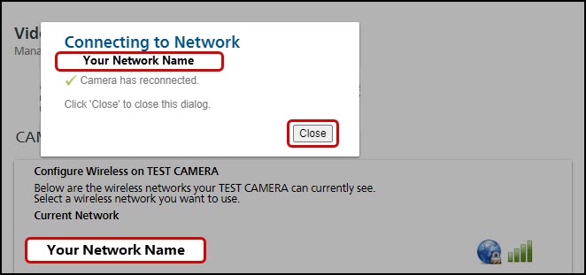When the camera reboots and successfully connects to wireless, you will see a message that it has reconnected. Press Close.