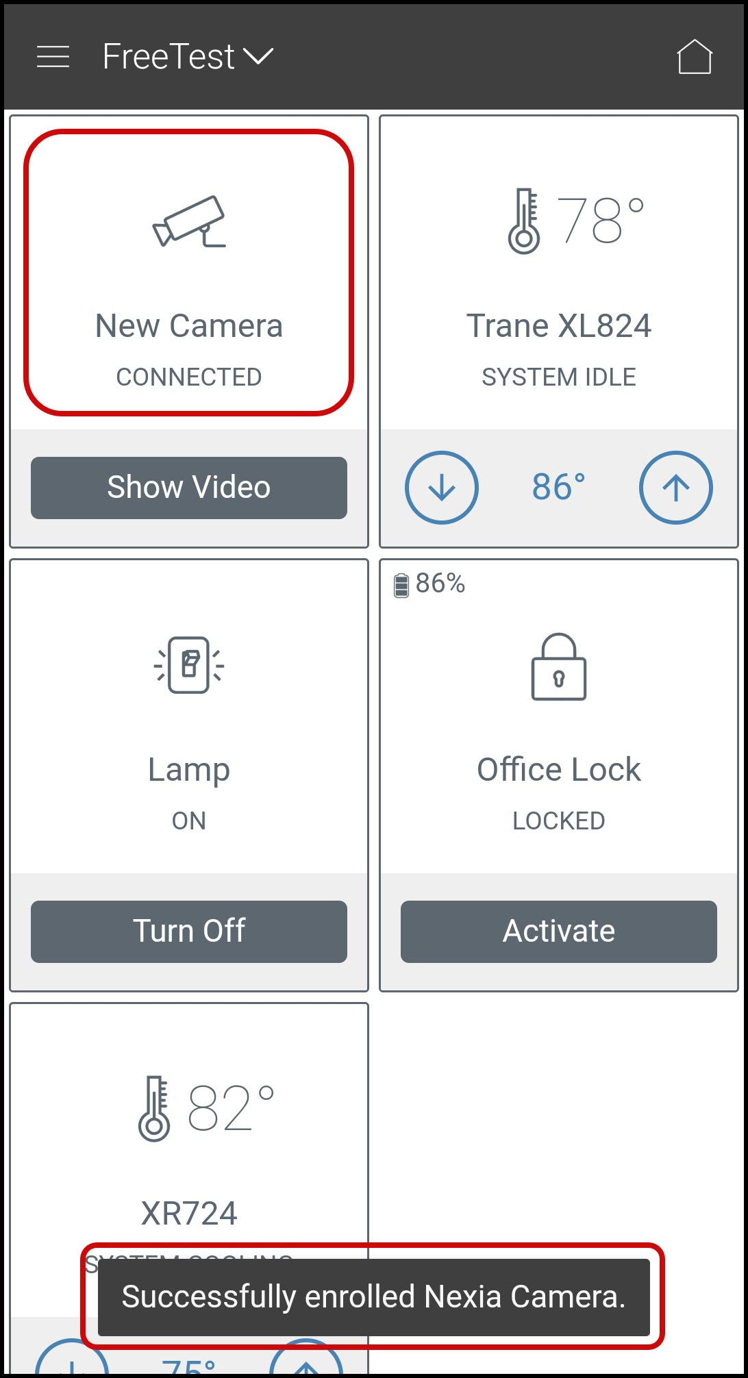 - When complete, the app will return to the dashboard, which will now display the new camera and a message that the camera has been successfully enrolled.