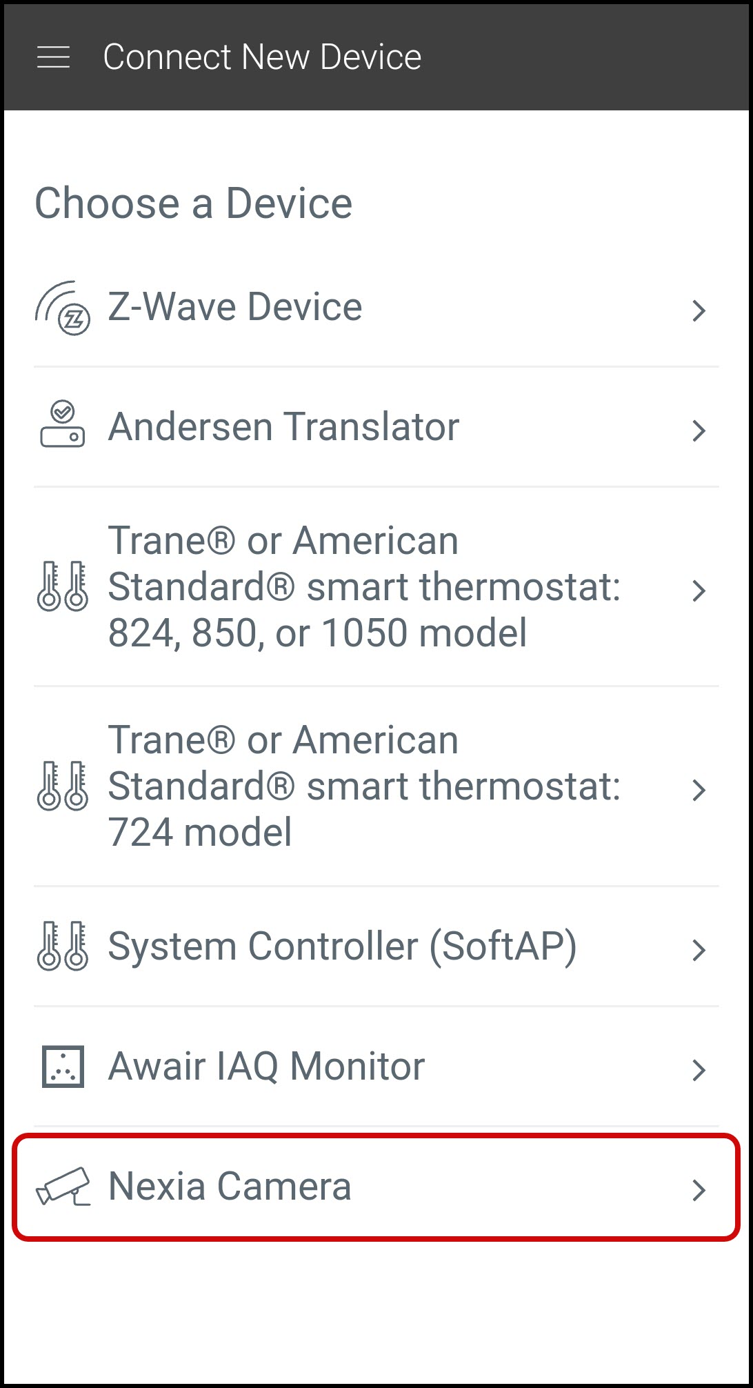 - Select Nexia Camera.