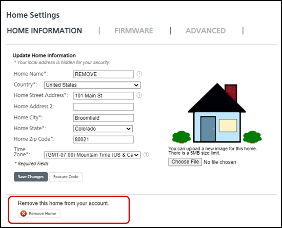 - In the home settings screen, locate and click Remove Home.