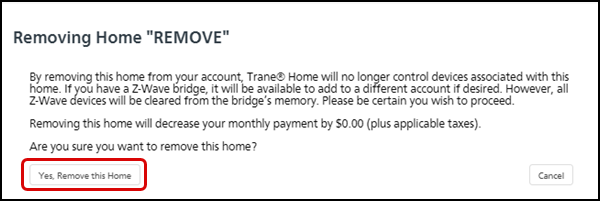 - Confirm that you want to remove this home. The message displayed will advise you of any decrease in your monthly payment based on your subscription type; if the home is on a free subscription, this amount will be $0.